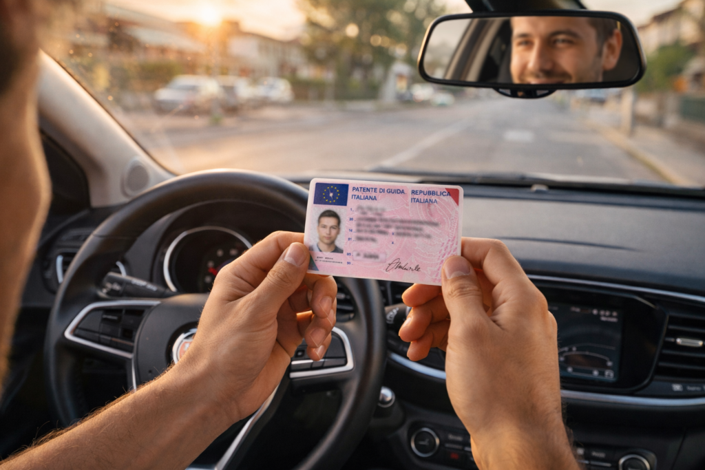 Fotografia realistica di una persona (viso non completamente visibile, focus sulle mani) che tiene la patente italiana appena ricevuta con entrambe le mani, davanti a un cruscotto auto moderna parcheggiata lungo i portici di via XX Settembre o piazza del Comune. Luce naturale che crea alone dorato. Orologio sul cruscotto che segna l’ora di metà mattina (simbolo di efficienza). Atmosfera di trionfo tranquillo, non aggressivo. Colori caldi con il Torrazzo sfocato sullo sfondo.https://www.minicarpoint.com/